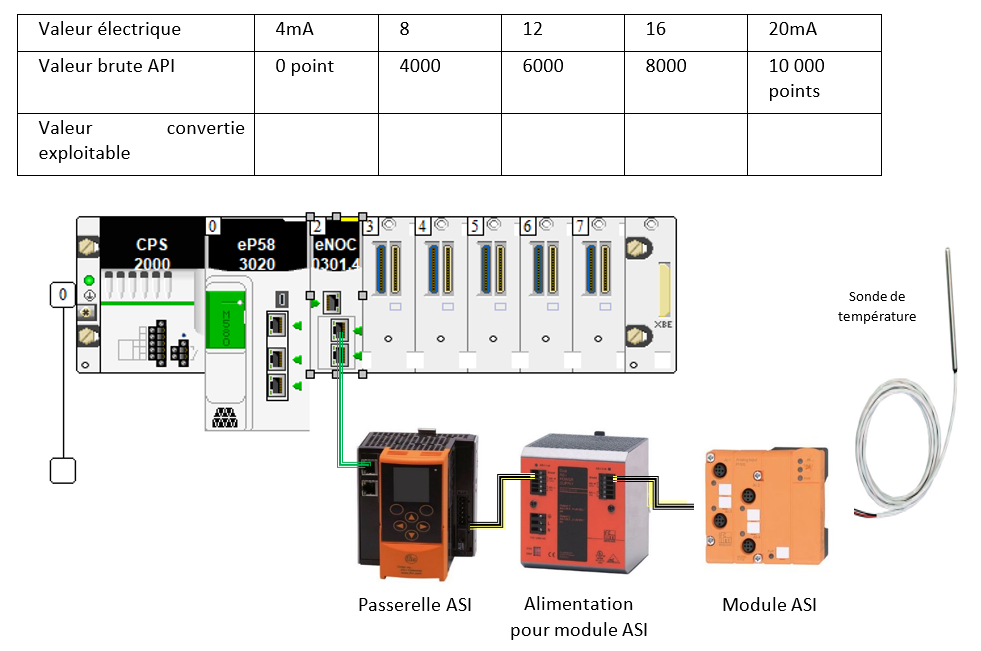 On doit donc convertir la valeur en points API vers une valeur réelle exploitable. Dans notre application, nous utilisons des sondes de température PT100 dont le signale de sortie n’est pas compris entre 0-20mA.